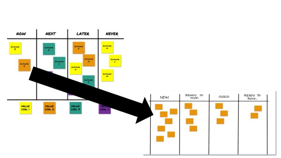 The guideline: don’t split an item down into small backlog items until it’s in the Now column of your roadmap.