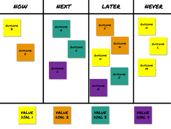 The main criteria you use for putting items on the roadmap, and deciding which ones go to Now is how well they support you product strategy (if you have one) and help you accomplish your targeted outcome.